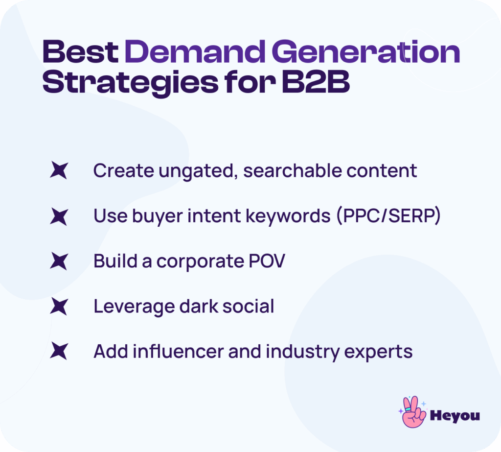 In B2B, demand generation warms future buyers by teaching them about problems, outcomes, and solution categories long before they’re ready to speak to sales. Examples include:
