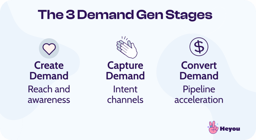Demand generation works by guiding buyers through three core stages of the modern B2B buying journey: creating awareness, capturing active intent, and converting that intent into pipeline. Each stage influences different buyer behaviors and requires a unique mix of channels, content, and messaging. When combined, they warm future buyers, surface in-market demand, and accelerate revenue generation.
