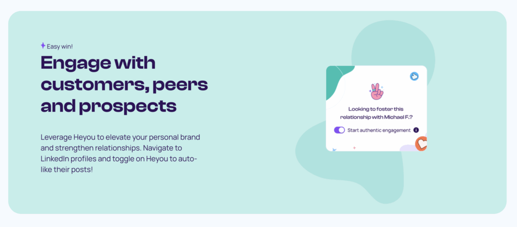 Heyou – Heyou is a LinkedIn engagement automation platform that helps you and your team auto-like company, peer, and promoted posts, track organic analytics, and boost visibility, while claiming to avoid bot-like behavior and cookie-based risks. Not full outreach (messaging / connection automation), and users should consider LinkedIn’s policies and rate limits.